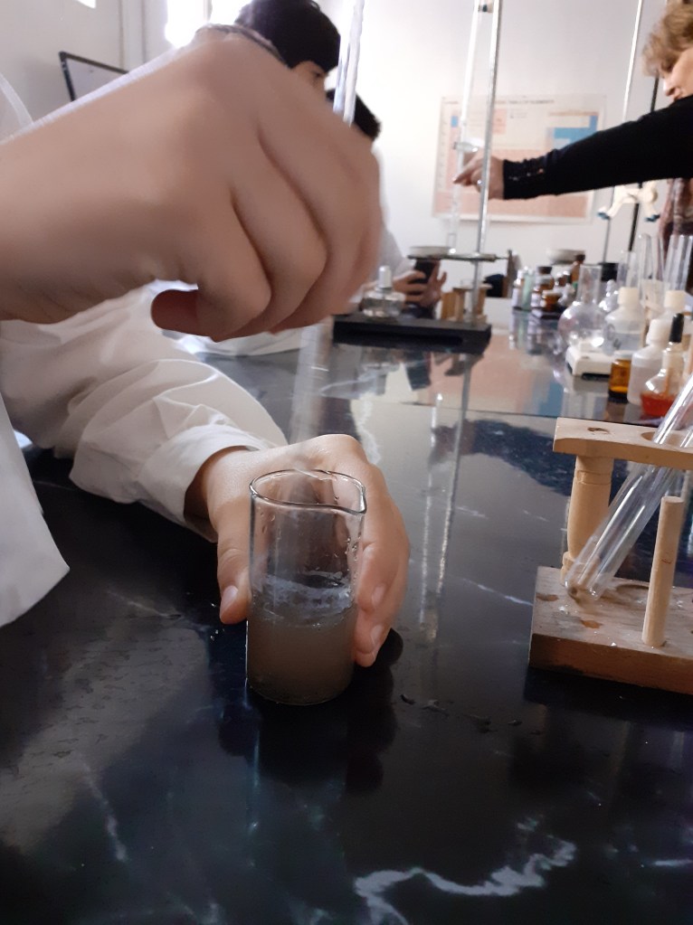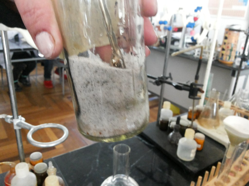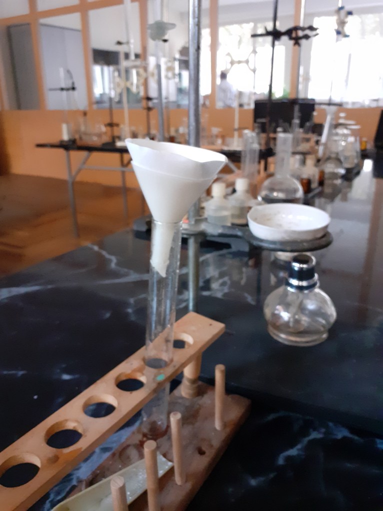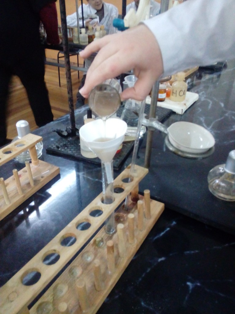 գլանաձև դնում ձագարի մեջ, իսկ ձագարը նոր անոթի մեջ: Ձագարի մեջ լցնում ենք կեղտոտ աղի լուծույթ, այդ ժամանակ տեղի է ունենում ֆիլտրում, աղաջուրը անցնում է թղթի միջով, իսկ ավազը և ուրիշ կեղտերը մնում են: Ապա երբ ֆիլտրումը ամբողջությամբ տեղի է ունեցել մնում է աղը առանձնեցնել ջրից, Դամենք մենք կանենք ջուրը եռաղնելով: Վերցնում ենք սպիրտայրոցը, վառում, և դնում ենք տակդիրի վրա, ապա օղերից մեկի վրա դնում ենք թասիկ և մեջը լցնում ենք մեր աղաջուրը: որոշ ժամանակից գուրը եռում, գոլոշիանում է և մնում է մաքուր աղ: