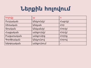 Գոյականը ունի հոլովում՝ Ուղղական, սեռական, տրական, հայցական, բացառական, գործիական, ներգործական։